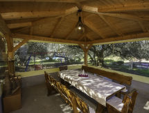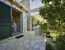House situated on the southern shore of the island of Pasman, in the beautiful bay of Soline, near the archipelago of Kornati (National Park). 2-family house "Franka", 2 storeys. In a secluded position, 20 m from the sea, 20 m from the beach. Private: property 2'400 m2, garden with lawn and trees. Barbecue, children's playground. Available: boat (extra). Motor access to the house (via unmade road). Parking at the house on the premises. Pebble beach, rocky beach 20 m. Please note: private mooring. The house can be reached only by boat or by off road cars, via unmade road. Transfers arranged by the owner on the day of arrival/departure (included). Owner's motor-boat 3 m long can be hired (extra).Interior