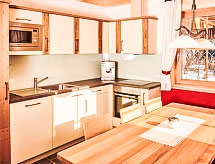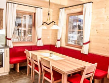 5-room cottage 110 m2 on 2 levels. Object suitable for 6 adults + 2 children. Romantic and wooden furniture furnishings: entrance hall. 1 double bedroom. Open living room with satellite TV (flat screen), wood-burning stove. Exit to the terrace. Open kitchen (oven, dishwasher, 4 ceramic glass hob hotplates, microwave, freezer, electric coffee machine) with dining nook. 2 showers/WC, double hand-basin. Floor heating. Top floor: 1 room with 2 beds (90 cm, length 200 cm). 2 double bedrooms. Exit to the balcony. Balcony 7 m2, south facing position, large terrace 20 m2, south facing position. Terrace furniture, deck chairs (4). Very beautiful panoramic view of the mountains. Facilities: washing machine, children's high chair, baby cot for up to 2 year olds, hair dryer. Internet (WiFi, free). Please note: suitable for families. Non-smokers only. 1 pet/ dog allowed. Smoke alarm. In the attic one of the best is a bunk bed in the attic.- Facilities