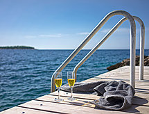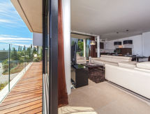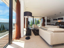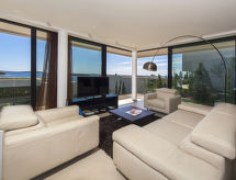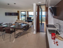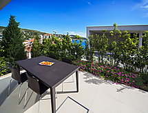 3-room apartment 115 m2 on 2 levels, on the ground floor. Comfortable and modern furnishings: living/dining room with satellite TV (flat screen). Exit to the balcony. Open kitchen (oven, dishwasher, 4 ceramic glass hob hotplates, freezer). Sep. WC. On the lower ground floor: 1 room with 2 beds. 1 double bedroom. Exit to the terrace. Shower/WC. Forced-air heating. Balcony 5 m2, terrace 10 m2 partly roofed, terrace 20 m2. Terrace furniture. Beautiful view of the sea. Facilities: Internet (WiFi, free). 1 pet/ dog allowed. The apartment is situated on the same grounds with 5 star villas HR4600.203-207.- Facilities