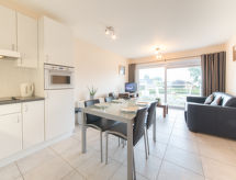 Child friendly, modern apartment block "Residentie Green Garden", 3 storeys. 750 m from the centre of De Haan, 1.3 km from the sea, 1.3 km from the beach. For shared use: beautiful garden to relax, pond, swimming pool (20 x 10 m, seasonal availability: 16.Jun. - 15.Sep. pool opening hours: 08:00-20:00). Poolhouse with shower, boccia. In the complex: lift. Shop, supermarket 700 m, restaurant 500 m, bakery 700 m, pedestrian zone 50 m, 15 minute walk to the centre, tram "Centrum De Haan" 1 km, bus stop "Centrum De Haan", railway station "Oostende" 14 km, sandy beach "De Haan" 1.6 km, park "La Potiniere" 750 m. Golf course 3 km, surf school 1.9 km, sailing school 1.9 km, tennis 6 km, riding stable 2.6 km. Nearby attractions: De Haan-Centrum: woensdag 700 m, Boudewijnpark 21 km, Plopsaland De Panne 52 km. Hiking paths: Bospad 50 m. Please note: suitable for families. Neighbourhood highly sensitive to noise. Quietness and good behaviour expected.Interior