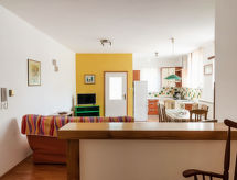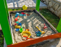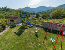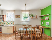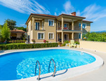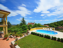 Mihelići 5 km from Opatija: Beautiful 3-family house "Kate". Above Opatija, in the hamlet Mihelici 5 km from the centre of Opatija, in a quiet, sunny position, 5 km from the sea, 5 km from the beach, located by a road, in the countryside. For shared use: property 1'400 m2, well-kept garden with lawn and flowers, swimming pool (23 m2, depth 150 cm, seasonal availability: 15.May. - 15.Sep.). Arbour (26 m2), garden furniture, barbecue (swing). In the house: internet access, trampoline. Parking at the house on the premises. Shop 2 km, restaurant 300 m, pebble beach 5 km, public bathing area 6 km, concrete beach 5 km. Tennis 1 km. Please note: Additional accommodations can be booked. The swimming pool is oval shaped.Interior