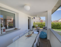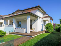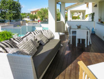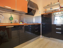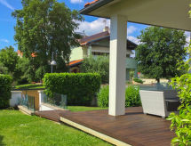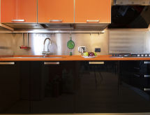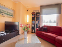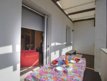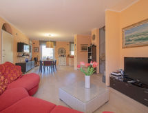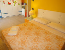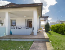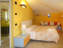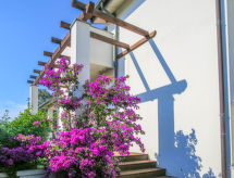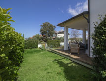 5-room house 140 m2 on 2 levels. Object suitable for 4 adults + 1 child. Spacious, comfortable and tasteful furnishings: large living/dining room with TV and digital TV (flat screen), radio and CD-player. Exit to the patio. Kitchenette (5 hot plates, oven, microwave). Sep. WC. Upper floor: 1 room with 2 beds, 1 pull-out bed and fan. 1 double bedroom with fan. 2 showers/bidet/WC. Patio, garden. Facilities: washing machine. Internet (WiFi, free). The property, modern and bright, consists of two levels. The spacious dining room can host nice family meals and the patio represents a perfect place to relax while sitting outside enjoying the garden.- Facilities