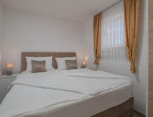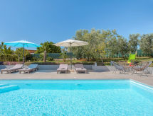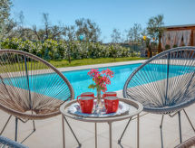 4-room house 73 m2. Living/sleeping room 18 m2 with 1 french bed (160 cm, length 200 cm), dining table, kitchen corner and satellite TV (flat screen), air conditioning. Living/dining room 20 m2 with satellite TV (flat screen), air conditioning. 2 rooms, each room with 1 french bed (160 cm, length 200 cm). Open kitchen (oven, dishwasher, 4 ceramic glass hob hotplates, microwave, freezer, electric coffee machine). 2 showers/WC. Deck chairs. View of the swimming pool. Facilities: iron, mosquito net, baby cot, hair dryer. Internet (WiFi, free). One house with living/sleeping room, open kitchen. The other house with living/dining area, open kitchen, 2 bedrooms.- Facilities