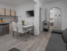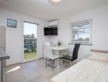 Child friendly, beautiful single-family house "Leonardo". In the hamlet Paolija 2.5 km from the centre of Novigrad, in a quiet, sunny position, 2.5 km from the sea, 2.5 km from the beach. Private: property 1'000 m2 (fenced), garden with wildlife garden and trees, swimming pool angular, heated (8 x 4 m, depth 150 cm, seasonal availability: 01.Jan. - 31.Dec.) with internal staircase. Outdoor shower, terrace (12 m2), garden furniture, barbecue, children's playground (slide, swing). In the house: internet access, trampoline, washing machine. Motor access to the house (200 m via unmade road). Parking (for 2 cars) at the house on the premises. Supermarket 2.5 km, restaurant 1 km, pebble beach 2.5 km, rocky beach 2.5 km. Walking paths from the house 100 m, cycle lane 150 m. Nearby attractions: aquapark 5 km. Please note: suitable for families. The unit consists of 2 houses rented as one unit. Swimming pool heated (extra). It is necessary to announce 7 days in advance if the pool heating is required. Youth groups are not allowed.Interior