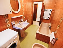 4-room apartment 80 m2 on 1st floor. Object suitable for 6 adults + 2 children. Bright, practical and comfortable furnishings: living/dining room with 1 double sofabed and TV. Exit to the terrace. 1 room with 1 double bed. 1 room with 3 beds. 1 room with 1 bed. Kitchenette (4 hot plates, microwave). Bath/bidet/WC, sep. WC. Air-conditioning (extra). View of the garden. Facilities: washing machine. Reserved parking (1 car). Please note: non-smoking house. 1 pet/ dog allowed.- Facilities