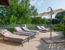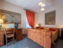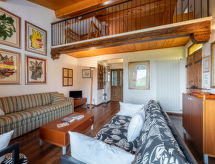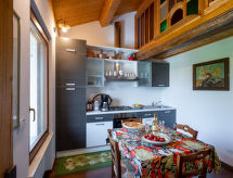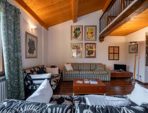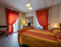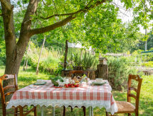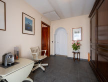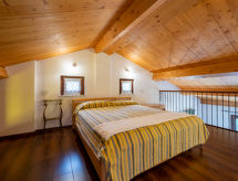 3-room apartment 120 m2 on 2 levels. Rustic and cosy furnishings: upper floor: living/sleeping room with 1 sofabed and TV. Exit to the terrace. Living/dining room with dining table, kitchen corner and TV. Exit to the terrace. 1 room with 1 french bed (160 cm). Kitchen (oven, 4 gas rings, toaster, kettle, microwave, freezer, electric coffee machine) with dining table. Bath/WC. 2nd upper floor: open, 1 room with 1 french bed (160 cm). Shower/WC. Heating. Heating available only from 01.10. to 30.04. Parquet floors. Terrace 60 m2. Terrace furniture, deck chairs. Facilities: Internet (WiFi, free). Please note: non-smokers only. Maximum 1 pet/ dog allowed. Private entrance. No internal connecting door between the separated properties. CIR: 00504800003- Characteristics of the accommodation