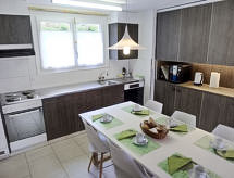 "Ramabrice", 4-room apartment 65 m2, on the ground floor. Comfortable and cosy furnishings: living/dining room with cable TV, flat screen, video and DVD. Exit to the terrace. 1 double bedroom with 1 double bed. 1 children's room with 2 beds (90 cm, length 190 cm). 1 room with 2 beds (90 cm, length 190 cm). Open kitchen (3 hot plates, oven, dishwasher, microwave, electric coffee machine, raclette grill, fondue Set (cheese)) with dining table, dining nook and heating stove. Bath/WC. Large terrace 40 m2 partly roofed, patio 20 m2, partly roofed. Terrace furniture, barbecue, deck chairs (4), box-room. Partial view of the lake, the mountains, the valley, the countryside and the resort. Facilities: children's high chair, baby cot for up to 2 year olds (extra), hair dryer. Internet (WiFi, free). Reserved parking (1 car) at the house. Please note: non-smokers only.- Facilities