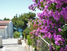2-room apartment 50 m2, on the ground floor, south facing position. 1 room with 1 french bed (160 cm, length 200 cm), bath/WC. 1 room with 1 french bed (180 cm, length 200 cm), bath/WC. Dining room 10 m2 with satellite TV (flat screen), air conditioning. Exit to the terrace. Open kitchen (4 hot plates, oven, kettle, freezer, electric coffee machine). Terrace 40 m2. Terrace furniture. Facilities: washing machine, iron, hair dryer. Internet (WiFi, free). 1 pet/ dog allowed.- Facilities