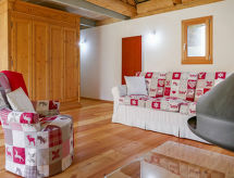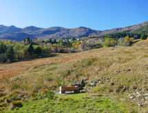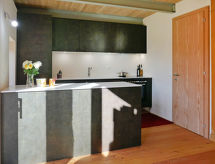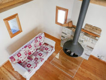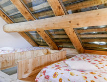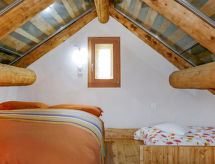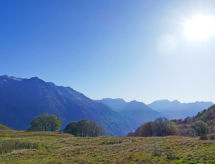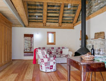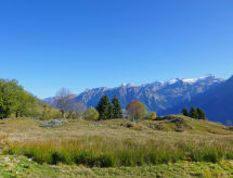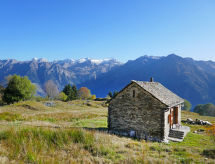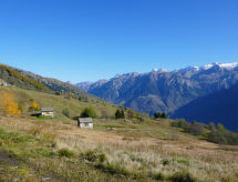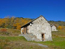 "Rustico Andrea", 2-room house south facing position. Bright, partly with sloping ceilings, tasteful and cosy furnishings: open living/dining room with open-hearth fireplace, TV and electric heating. Exit to the garden. Open kitchen (oven, dishwasher, 4 ceramic glass hob hotplates, freezer, raclette grill, fondue Set (cheese)) with bar. Exit to the terrace. Shower/WC. Electric heating. Upper floor: (steep stair), 1 open room with sloping ceilings with 2 beds (90 cm, length 200 cm), 1 double bed (1 x 200 cm, length 210 cm). Wooden floors. Barbecue (portable), deck chairs (2). Marvellous panoramic view of the mountains and the valley. Facilities: hair dryer. Internet (WiFi). Please note: non-smoking house. 2 pets/ dogs allowed. Fire extinguisher. NL-00003893- Facilities