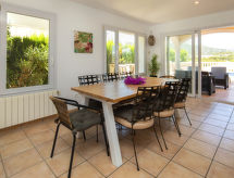 "Sandra", 5-room house 160 m2 on 2 levels. Comfortable furnishings: living/dining room 30 m2 with open-hearth fireplace, satellite TV, digital TV, air conditioning and forced-air heating. Exit to the terrace. 1 room with 1 french bed (150 cm, length 190 cm), shower/WC, air conditioning and forced-air heating. Kitchen (oven, dishwasher, 4 ceramic glass hob hotplates, toaster, kettle, microwave, freezer, electric coffee machine). Sep. WC. Heating. Upper floor: 1 room with 1 french bed (150 cm, length 190 cm), bath/bidet/WC, air conditioning and forced-air heating. Exit to the balcony. 2 rooms, each room with 2 beds (90 cm, length 190 cm), air conditioning and forced-air heating. Shower/WC. Heating. Terrace. Terrace furniture, barbecue, deck chairs (6). Panoramic view of the mountains. Facilities: washing machine, iron, children's high chair, baby cot for up to 2 year olds, hair dryer. Internet (WiFi, free). Reserved parking at the house. Please note: non-smoking house. VT-487189-A- Characteristics of the accommodation