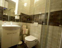 3-room apartment 45 m2, on the ground floor, south-west facing position. Living/dining room with satellite TV (flat screen), air conditioning. Exit to the terrace. 1 room with 1 french bed (140 cm, length 200 cm). 1 room with 2 beds (90 cm, length 200 cm). Entrance hall. Exit to the terrace. Open kitchen (4 hot plates, oven, microwave, freezer, electric coffee machine). Shower/WC. Terrace 16 m2, terrace 8 m2. Terrace furniture. Partial view of the sea. Facilities: washing machine, iron, hair dryer. Internet (WiFi, free).- Facilities
