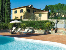 Casa de campo "Al Tramonto", bonita, confortable de 2 plantas, reformada en 2015, rodeada de árboles, campos y viñedos. 2 casas en la residencia. 5 apartamentos en la residencia. Alojamiento compuesto de edificio principal y edificio anexo, a 2 km del centro de Impruneta, a 9 km del centro de Greve in Chianti, a 10 km del centro de Firenze, lugar soleado, elevado en una pendiente, area residencial (villas), en el campo. Comunitario: terreno 4'000 m2 (vallado) con césped y árboles, jardín natural, piscina vallada (10 x 5 m, 120 - 170 cm de profundidad, Disponible por temporada: 15.May. - 15.Oct.) con sistema de limpieza por electrolysis de sal. Ducha exterior, terraza, muebles de jardín, barbacoa, mantenimiento de la piscina a través del propietario/jardinero. Acceso hasta 50 m de la casa. 50 m camino hasta la casa. Aparcamiento junto a la casa en el mismo terreno. Tienda, tienda de comestibles 2 m, supermercado 2 km, restaurante 1.5 km, bar 2 km, panadería 2 km, parada de autobús 2 km, estación de tren "Florence" 10 km, piscina cubierta 10 km. Campo de golf (18 hoyos) 7 km, rutas de senderismo desde la casa 100 m. Atracciones en los alrededores: Siena 70 km, San Gimignano 50 km, Pisa 90 km, Lucca 90 km. A tener en cuenta: adecuado para familias, equipamiento para bebés (incluido). El propietario vive en el mismo terreno. Todas las casas/apartamentos están diseñadas y amuebladas de manera diferente.Interior