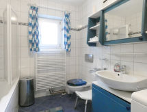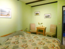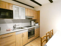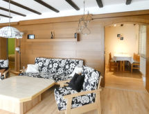 Apartamento de 3 habitaciones 75 m2, en la planta baja. Con mobiliario agradable: salón-comedor 35 m2 con TV satélite (pantalla plana), vídeo, CD, DVD y colección de DVD a disposición. Salida al jardín, a la terraza. 1 dorm. 13 m2 con 1 cama doble (190 cm, 200 cm de longitud). 1 dorm. 9 m2 con 1 cama (80 cm, 190 cm de longitud), 1 x 2 literas (90 cm, 190 cm de longitud), TV satélite (pantalla plana), vídeo, CD y DVD. Cocina abierta 9 m2 (horno, lavavajillas, 4 placas de vitrocerámica, tostadora, hervidor de agua eléctrico, microondas, cafetera eléctrica) con mesa de comedor. Baño/ducha/WC. Calefacción de gas. Terraza grande 30 m2 parcialmente cubierta, jardín 250 m2, césped 150 m2. Muebles de terraza, barbacoa (portátil), tumbonas (2), rincón para sentarse. Vista bonita a las montañas. El alojamiento dispone de: lavadora, caja fuerte, plancha, trona, secador de pelo. Internet (Wifi, gratis). Lector de Blu-ray. A tener en cuenta: apartamento para no fumadores. Entrada privada, adecuado para personas con alergias, detector de humo.- Características del alojamiento