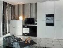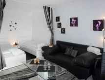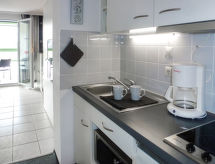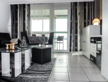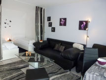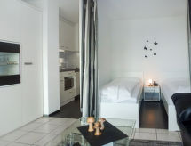 "B 97" estudio 37 m2 en el 2° piso. Con mobiliario moderno y agradable: salón-comedor con 1 sofá-cama y TV satélite (pantalla plana), radio. Rincón-dormitorio con cortina con 2 camas (90 cm, 200 cm de longitud). Rincón-cocina (2 fogones, tostadora, hervidor de agua eléctrico, microondas, cafetera eléctrica). Ducha/WC. Balcón. Muebles de balcón. El alojamiento dispone de: teléfono, trona (extra). Internet (ADSL, gratis). A tener en cuenta: apartamento para no fumadores. Permitido máximo 1 mascota / perro.- Instalaciones