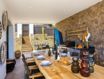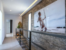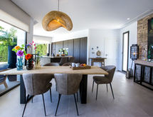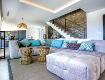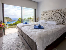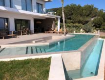 Villa "El Refugio", muy amplia, muy moderna, muy lujosa de 2 plantas del año 2021. En el barrio de Mar Azul - Portitchol, lugar tranquilo, soleado, a 200 m del mar, a 400 m de la playa. Privado: jardín en diferentes niveles grande, bonito, cuidado con césped y árboles, piscina (13 x 4 m, 110 - 160 cm de profundidad, Disponible por temporada: 01.Ene. - 31.Dic.) con escalera interior. Ducha exterior, porche, terraza, muebles de jardín, caseta de barbacoa. En el inmueble: aire acondicionado. Aparcamiento (para 3 coches) en el mismo terreno. Tienda 2.5 km, supermercado 3 km, restaurante 600 m, playa de arena "El Arenal" 5 km, playa de piedras "Cala Barraca o Portitxol" 500 m. Escuela de surf 600 m, tenis 3.5 km. El propietario no acepta grupos de adolescentes/jóvenes.Interior