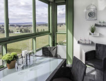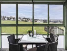 "F 96", apartamento de 2 habitaciones 54 m2 en el 2° piso. Con mobiliario moderno y de buen gusto: salón-comedor con TV satélite (pantalla plana). Rincón-dormitorio con cortina con 1 x 2 literas. 1 dorm. con 1 cama doble (2 x 100 cm, 200 cm de longitud). Rincón-cocina (horno, lavavajillas, 4 placas de vitrocerámica, tostadora, hervidor de agua eléctrico, microondas, cafetera eléctrica). Baño/WC. Balcón. Muebles de balcón. Vista bonita al paisaje. El alojamiento dispone de: plancha, trona (extra), secador de pelo. A tener en cuenta: apartamento para no fumadores.- Instalaciones