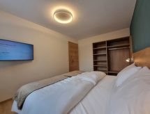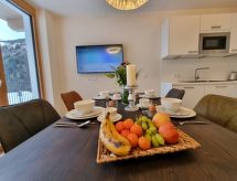 "Fichte", apartamento de 2 habitaciones 45 m2 en el 1° piso. Espacioso y luminoso, con mobiliario muy moderno y agradable: 1 dorm. doble con TV cable (pantalla plana). Cocina-comedor (lavavajillas, 4 placas de vitrocerámica, tostadora, hervidor de agua eléctrico, microondas, cafetera eléctrica) con 1 sofá-cama. Ducha/WC. Suelo de madera, suelo de piedra natural. Terraza 18 m2. Vista espléndida a las montañas. El alojamiento dispone de: Internet (Wifi, gratis). Plaza de aparcamiento n. 3 (1 coche). A tener en cuenta: apartamento para no fumadores.- Instalaciones