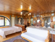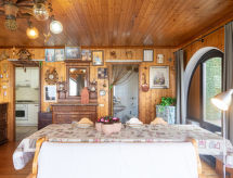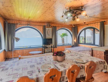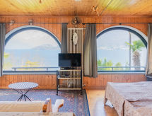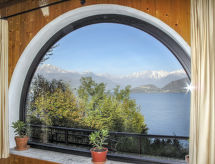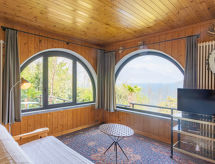 Casa estudio 45 m2, orientación este. Con mobiliario agradable y con mucha madera: salón-dormitorio con ventanal con 1 cama doble, mesa de comedor, TV satélite y CD. Salida al jardín. Cocina (horno, 4 fuegos, tostadora, congelador, cafetera eléctrica). Ducha/WC. Calefacción de gas. Suelo de madera. Terraza-jardín. Tumbonas (2). Vista panorámica espléndida al lago y a las montañas. El alojamiento dispone de: lavadora, trona, cuna. 2 mascotas / perros. CIR: 013183-CNI-00038- Instalaciones