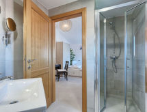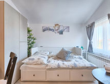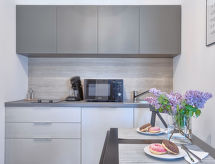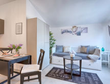 Estudio 35 m2 en el 1° piso. Estudio con 1 cama-nido (2 pers. 2 x 80 cm, 200 cm de longitud), TV satélite (pantalla plana), aire acondicionado. Cocina abierta (2 placas de vitrocerámica, microondas, cafetera eléctrica) con mesa de comedor. Ducha/WC. Aire caliente. El alojamiento dispone de: Internet (Wifi, gratis).- Instalaciones