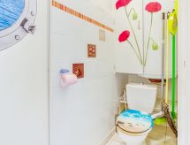 Casa adosada 3 habitaciones 55 m2, orientación noroeste. Salón-comedor con TV (pantalla plana), DVD. Salida al jardín, a la terraza. Rincón-cocina (horno, lavavajillas, 3 Placas de inducción, tostadora, hervidor de agua eléctrico, microondas, cafetera eléctrica). WC separado. Calefacción eléctrica. Planta superior: 2 dorm., cada habitación con 1 cama de matrimonio (140 cm, 190 cm de longitud). Ducha/WC. Terraza 30 m2. El alojamiento dispone de: lavadora. Internet (Wifi, extra). Plaza de aparcamiento n. 6970 junto a la casa. A tener en cuenta: detector de humo.- Características del alojamiento