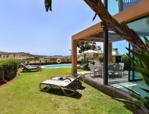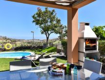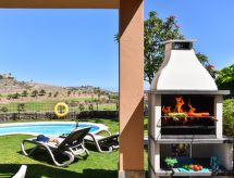 Villa, bonita, amplia, idónea para niños "Lagos 5", rodeada de campos. Equipamiento de la vivienda: aire acondicionado, lavadora (privado). Parking: parking al lado de la vivienda, garaje individual en la calle. Acceso en coche todo el año. Camino en pendiente. Sendero en pendiente. Situación: lugar aislado, tranquilo, soleado. Vista desde la vivienda a las montañas, al jardín y al paisaje. Entorno de la vivienda: jardín (privado), terreno con hierba (privado, 310 m2), piscina (privado, climatizada), ducha exterior (privado), barbacoa (privado). Infraestructura y distancias: tienda 900 m, supermercado 900 m, restaurante 350 m, piscina 1 m, playa de arena 14.5 km, campo de golf 900 m, parada de autobús 2 km. A tener en cuenta, en las proximidades hay un aeropuerto a 39.1 km. Climatización de la piscina (extra: 40 €/día) a solicitar en la reserva y a pagar en plaza.Interior