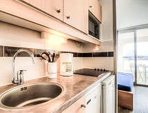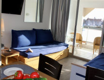Apartamento de 2 habitaciones 31 m2 en el 1° piso. Entrada. Salón-comedor con TV. Salida al balcón cubierto, orientación sur. 1 dorm. con 1 cama de matrimonio (140 cm, 190 cm de longitud). Rincón-cocina (2 fogones, horno, lavavajillas, tostadora, hervidor de agua eléctrico, cafetera eléctrica). Baño, WC separado. Calefacción eléctrica. Suelo de parquet. Terraza 6 m2, cubierta, orientación sur. Muebles de balcón. Vista bonita al puerto. El alojamiento dispone de: Internet (Wifi, extra). A tener en cuenta: apartamento para no fumadores, sin aparcamiento. Detector de humo.- Características del alojamiento