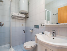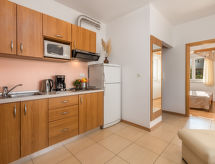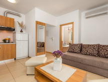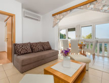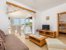 "Mare 5", apartamento de 3 habitaciones 50 m2 en el 1° piso. Con mobiliario bonito y moderno: salón-comedor 25 m2 con 1 sofá-cama doble, TV satélite y aire acondicionado. Salida al balcón cubierto. 1 dorm. con 1 cama doble (160 cm, 200 cm de longitud). 1 dorm. con 1 x 2 literas. Cocina abierta (4 fogones, microondas, congelador). Ducha/WC. Vista espléndida al mar. El alojamiento dispone de: caja fuerte. Internet (Wifi, gratis). Plaza de aparcamiento.- Instalaciones