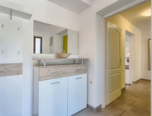 Casa con varias viviendas "Muki", bonita. A 600 m del centro de Medulin, lugar tranquilo, soleado, a 500 m del mar, a 700 m de la playa. Comunitario: terreno 1'850 m2 (vallado), jardín bonito con césped y plantas. Muebles de jardín, barbacoa. En el inmueble: acceso a internet, sala para guardar bicicleta. Aparcamiento junto a la casa en el mismo terreno. Tienda 200 m, supermercado, restaurante 300 m, playa de arena 1 km playa de gravilla, playa rocosa 700 m. Campo de golf 6 km, escuela de surf 2.5 km, tenis 2.5 km, centro ecuestre 2 km, rutas de senderismo desde la casa 200 m, caminos para bicicletas 250 m. Aparcamiento para caravana (extra).Interior