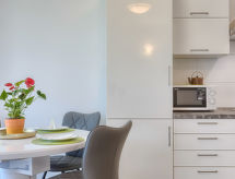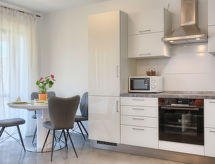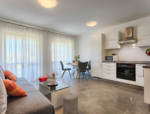 Apartamento de 3 habitaciones 100 m2, en la planta baja. Salón-comedor con TV satélite (pantalla plana), aire acondicionado. Salida a la terraza. 1 dorm. con 1 cama de matrimonio (160 cm, 200 cm de longitud). 1 dorm. con 2 camas (80 cm, 200 cm de longitud). Salida a la terraza. Cocina abierta (horno, lavavajillas, 4 placas de vitrocerámica, microondas, congelador, cafetera eléctrica). Ducha/WC. Aire acondicionado (extra). Terraza 25 m2, cubierta. Muebles de terraza. Vista al jardín. El alojamiento dispone de: lavadora (extra). Cuna (extra). Internet (Wifi, gratis).- Instalaciones