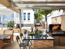"8 PAX", casa 5 piezas para 8 personas, 400 m2, con mobiliario moderno y agradable. Salón-comedor con TV regional y TV satélite. Fumar no permitido. Internet (Wifi). Dormitorio con 1 cama doble. Dormitorio con 1 cama doble. Dormitorio con 1 cama doble. Dormitorio con 2 camas individuales. Cocina-comedor con 3 quemadores, microondas, horno, mesa de comedor, lavavajillas, frigorifico y congelador. Baño, baño/WC, ducha/WC y baño/ducha/WC. Balcón, terraza, muebles de terraza, 8 tumbonas. Otros equipamientos: caja fuerte, trona, secador de pelo, plancha, lavadora. 2020-T0090- Características del alojamiento