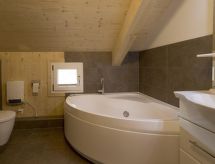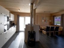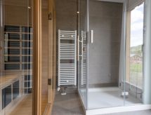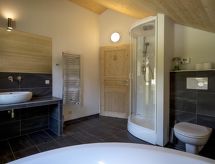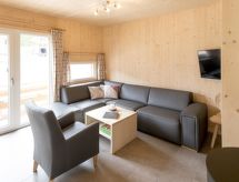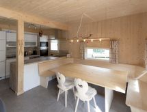 "Chalet Wellness Superior 8 P", 5-huoneen chalet, 100 m2, 2 tasossa. Vaalea, mukavasti ja paljon puuta sisustettu: olo/ruokailuhuone, ruokapöytä ja satelliitti TV (litteänäyttö). 3 kahden hengen huonetta. 1 huone, 2 vuodetta. Avoin keittiö (uuni, astianpesukone, 4 keraaminen keittotaso, mikroaaltouuni, kahvinkeitin). 2 suihkua/WC:tä, hierova suihku, poreamme. Terassi. Terassikalusteita. Kaunis panoraamanäkymä. Käytettävissä: Internet ( Langaton LAN [WLAN] , ilmainen). Huomioitavaa: savuton huoneisto. Savuhälytin. Loma-asunto on tyyppiesimerkki talosta tai huoneistosta.- Laitteet