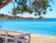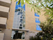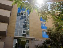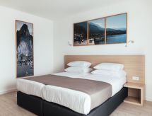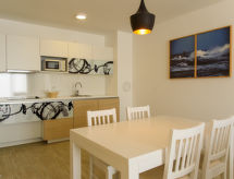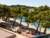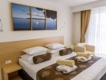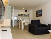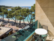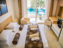 2-huoneen huoneisto, 64 m2, 1. kerroksessa. Olo/ruokailuhuone, 1 vuodesohva kahdelle (135 cm, pituus 180 cm), satelliitti TV (litteänäyttö), ilmastointi. Uloskäynti parvekkeelle. 1 huone, 1 kapea parisänky (180 cm, pituus 200 cm), satelliitti TV (litteänäyttö), ilmastointi. Uloskäynti parvekkeelle. Avoin keittiö (4 keraaminen keittotaso, mikroaaltouuni, pakastin, kahvinkeitin). Suihku/WC. Parveke. Parvekekalusteita. Näkymä merelle. Käytettävissä: tallelokero, hiustenkuivaaja. Internet ( Langaton LAN [WLAN] , ilmainen). Pysäköintipaikka (lisämaksu, 1 auto).- Laitteet