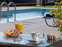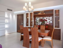 "David", 7-huoneen huvila, 250 m2, 3 tasossa. Avara ja vaalea, erittäin mukavasti ja uudenaikaisesti sisustettu: avoin iso olo/ruokailuhuone, ruokapöytä ja satelliitti TV (litteänäyttö), ilmastointi. Uloskäynti terassille. 1 kahden hengen huone, 1 parisänky ja ilmastointi. Uloskäynti terassille. Avoin keittiö (uuni, astianpesukone, 4 keraaminen keittotaso, leivänpaahdin, vedenkeitin, mikroaaltouuni, kahvinkeitin). Erillinen WC. Alemmassa kerroksessa: (portaat ilman kaidetta) olohuone, pienoiskeittiö ja ilmastointi. Uloskäynti puutarhaan. 1 kahden hengen huone, 1 parisänky ja ilmastointi. 1 lastenhuone, 1 vuode ja ilmastointi. Erillinen WC. Yläkerrassa: (portaat ilman kaidetta) 1 lastenhuone, 1 x 2 kerrossänky, satelliitti TV (litteänäyttö), ilmastointi. Uloskäynti parvekkeelle. 1 kahden hengen huone, 1 parisänky ja ilmastointi. Uloskäynti parvekkeelle. Kylpy/WC. Iso parveke, iso terassi. Terassikalusteita, parvekekalusteita, lepotuoleja, loggia (katos), istumapaikka. Kaunis panoraamanäkymä merelle, uima-altaalle, puutarhaan ja maaseudulle. Käytettävissä: pesukone, kuivausrumpu, silitysrauta, hiustenkuivaaja. Internet ( Langaton LAN [WLAN] , ilmainen). Huomioitavaa: savuton talo. Savuhälytin, palosammutin. 1228337- Laitteet