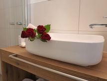 "Hirsch", 5-huoneen huoneisto, 120 m2, ylemmässä kerroksessa. Avara ja vaalea, mukavasti ja hyvällä maulla sisustettu: sisääntulo. 2 kahden hengen huonetta, kaikissa huoneissa, suihku/WC. Uloskäynti parvekkeelle. 1 kahden hengen huone, suihku/WC ja satelliitti TV (litteänäyttö). Uloskäynti parvekkeelle. 1 huone, 2 kerrossänky, 1 parisänky ja suihku/WC. Uloskäynti parvekkeelle. Keittiö/oleskelutila (uuni, astianpesukone, 4 keraaminen keittotaso, leivänpaahdin, vedenkeitin, mikroaaltouuni), ruokapöytä ja satelliitti TV (litteänäyttö). Uloskäynti parvekkeelle. Iso parveke, etelään ja pohjoiseen. Parvekekalusteita. Kaunis näkymä järvelle ja vuorille. Käytettävissä: sauna (lisämaksu). Internet ( Langaton LAN [WLAN] , ilmainen). Huomioitavaa: jääkaappi ilman pakastinlokeroa. 1 lemmikki/koira sallittu.- Laitteet