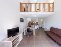 "Le Domaine de Bacchus (SIH101)", 1-huoneen rivitalo, 44 m2, 2 tasossa. Vaalea, käytännöllisesti ja uudenaikaisesti sisustettu: olo/makuuhuone, 1 vuodesohva kahdelle (130 cm), ruokapöytä ja TV. Uloskäynti terassille. Keittiönurkkaus (2 keraaminen keittotaso, vedenkeitin, mikroaaltouuni, kahvinkeitin). Erillinen WC. Yläkerrassa: parvi, 1 kapea parisänky (160 cm). Suihku. Sähkölämmitys. Terassi. Terassikalusteita. Käytettävissä: syöttötuoli, lastensänky (lisämaksu). Internet ( Langaton LAN [WLAN] , lisämaksu). Huomioitavaa: 2 lemmikkiä/koiraa sallittu. Savuhälytin. Kaupallisen omistajan tarjoama Art. 155, IV, CGI mukaisesti- Laitteet