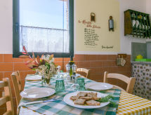 "Levante", 3-huoneen huoneisto, 65 m2, sisääntulokerroksessa. Kauniisti ja hyvällä maulla sisustettu: olo/ruokailuhuone. 1 kahden hengen huone. 1 huone, 2 vuodetta. Avoin keittiö (Kaasuhella, 4 kaasuhella, leivänpaahdin, vedenkeitin, kahvinkeitin), ruokapöytä. Suihku/bidet/WC. Kaasulämmitys (lisämaksu). Iso puutarhaistumapaikka 25 m2, osittain katettu. Terassikalusteita, puutarhagrilli, lepotuoleja (2). Kaunis näkymä maaseudulle. Käytettävissä: pesukone, silitysrauta, hyttysverkko, syöttötuoli, lastensänky alle 2 vuotiaalle, hiustenkuivaaja. Internet ( Langaton LAN [WLAN] , ilmainen). Huomioitavaa: 2 lemmikkiä/koiraa sallittu. Oma sisäänkäynti.- Laitteet