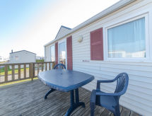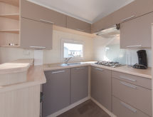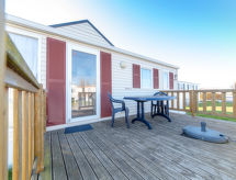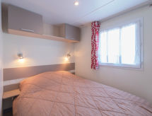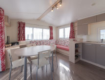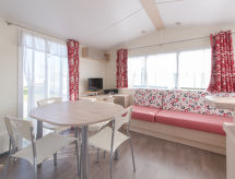 3-huoneen asuntovaunu, 34 m2. Käytännöllisesti ja mukavasti sisustettu: olo/ruokailuhuone, TV, kansainvälisiä TV-kanavia, litteänäyttö, radio ja CD. 1 kahden hengen huone, 2 vuodetta (90 cm, pituus 200 cm). 1 kahden hengen huone, 1 parisänky (1 x 140 cm, pituus 200 cm). Avoin keittiö (4 keittolevyä, kahvinkeitin). Suihku, erillinen WC. Sähkölämmitys. Terassi 15 m2. Käytettävissä: Internet ( Langaton LAN [WLAN] , ilmainen). Pysäköintipaikka (lisämaksu). Huomioitavaa: savuton talo. Savuhälytin, palosammutin.- Laitteet