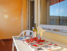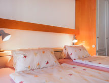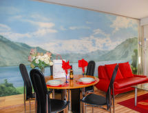 1-huoneen huoneisto, 50 m2, 5. kerroksessa, suunta lounaaseen. Avara ja vaalea, uudenaikaisesti ja viihtyisästi sisustettu: avoin olo/ruokailuhuone, 2 komerosänkyä (90 cm, pituus 200 cm), ruokapöytä ja kaapeli TV (litteänäyttö), radio. Uloskäynti parvekkeelle. Pieni keittiö (3 keittolevyä, uuni, vedenkeitin, mikroaaltouuni, kahvinkeitin). Kylpy/WC. Parveke 11 m2, länteen ja pohjoiseen. Parvekekalusteita, lepotuoleja (2). Osittainen näkymä järvelle, vuorille ja maaseudulle. Käytettävissä: hiustenkuivaaja. Internet ( Langaton LAN [WLAN] , ilmainen). Huomioitavaa: savuton huoneisto.- Laitteet