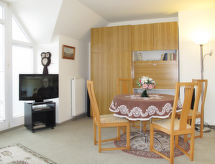 Complexe de vacances "Achterwasser". 7 maisons dans la résidence. 28 appartements dans la résidence. À 300 m du centre de Zempin, en bordure de la localité, à 3 km du centre de Zinnowitz, à 13 km du centre de Wolgast, à 1.5 km de la mer, à 300 m de la lagune. Place de parking sur le terrain. Supermarché 800 m, plage de sable 1.5 km, piscine couverte 4 km. Toutes les maisons/appartements sont aménagés individuellement. Les appartements sont répartis sur huit maisons mitoyennes de quatre appartements chacune. Les pelouses de l'établissement sont des terrains de jeux, les chiens n'y sont pas autorisés.Interior