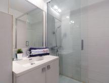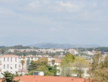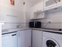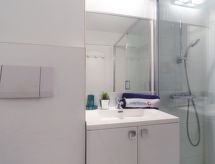 Studio 30 m2 au 5ème étage. Logement idéal pour 2 adultes + 2 enfants. Aménagement agréable: séjour avec 1 divan-lit double (1 x 140 cm, longueur 190 cm), TV (écran plat). Sortie sur la terrasse. Cabine avec 1 x 2 lits superposés (80 cm, longueur 190 cm). Coin cuisine (4 plaques de cuisson, lave-vaisselle, grille-pain, bouilloire électrique, cafetière électrique, combiné micro-ondes). Douche/WC. Grand balcon 6 m2. Mobilier de balcon. Vue éloignée sur les montagnes. A disposition: lave-linge, fer à repasser. Internet (Connexion WIFI, en sus). Place de parking No 43 (couvert, 1 Voiture), hauteur 190 cm, largeur 240 cm. Veuillez noter: logement côté rue. Logement non-fumeur. 1 animal/ chien autorisé. TV seulement FR. Détecteur de fumée.- Installations