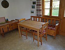 117 m2. Autres informations du fournisseur: Appartement de 4 pièces (114m2) au rez-de-chaussée dans un chalet qui a été construit en 1984. Situation tranquille et ensoleillée avec belle vue. 5 minutes à pied du centre du village. Place de parc ouverte. Grande terrasse avec jardin, balcon. Réduit pour skis et buanderie avec machine à laver à l'étage inférieur à l'usage commun. Cuisine séparée avec table à manger, lave-vaisselle, cafetière à capsules (Delizio) ainsi qu'un fondue- et raclette-set. Grande salle de séjour avec cheminée et table. TV/téléphone/radio, WiFi. 1 salle de bains avec baignoire/toilette. 1 chambre à coucher avec 2 lits individuels (2x100x190cm). 1 chambre à coucher avec 3 lits individuels (2x90x190cm), 1 lit gigogne (90x190cm) et 1 salle de bains avec douche/toilette. 1 chambre à coucher avec 2 lits individuels rapprochés (2x90x190cm). Lit d'enfant (70x140cm) lit d'enfant de voyage incl. draps et chaise haute disponibles. INCLUS: électricité, chauffage, eau, place de parc, bois de cheminée, machine à laver, WiFi, lit d'enfant (70x140cm) incl. draps, chaise haute, draps, linge de salle de bains et de cuisine (premier set), nettoyage final et taxes de séjour. EXCLUSIVE: Capsules pour la cafetière Delizio, café filtre. Frais de conversations téléphoniques. Animaux domestiques CHF 25.00 par séjour. ***Animaux bienvenus*** Important: Dans la plupart des appartemetns, seulement un animal domestique (en général un chien) est permis. En cas de plus ou d'autres animaux, il faut demander avant d'effectuer une réservation.- Caractéristiques de l'hébergement
