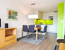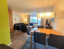 "Allod Park Haus C 604", apt 2 pièces 55 m2 au 6ème étage, situation sud. Spacieux et clair, partiellement rénové, aménagement très agréable et de bon goût: séjour/salle à manger avec 1 divan-lit double et TV (câblée) (écran plat). 1 chambre avec 1 lit double (2 x 90 cm). Cuisine ouverte (four, lave-vaisselle, 4 plaques vitrocéramiques, bouilloire électrique, cafetière électrique). Bain/WC. Balcon, situation sud. Mobilier de balcon. Très belle vue sur les montagnes, les pistes de ski et la localité. A disposition: Internet (Connexion WIFI, gratuit). Place de parking près de la maison. Veuillez noter: logement non-fumeur.- Installations