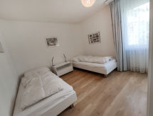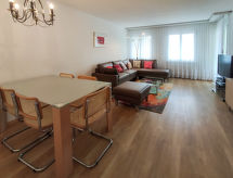 "Allod Park Haus B 403", apt 3 pièces 80 m2 au 4ème étage, situation sud-ouest. Rénové, aménagement très agréable et de bon goût: séjour/salle à manger avec TV (câblée) (écran plat). Sortie sur le balcon. 1 chambre avec 2 lits (90 cm), WC séparés. 1 grande chambre avec 1 lit double (180 cm). Cuisine (four, lave-vaisselle, 4 plaques à induction, cafetière électrique, Capsules pour machine à café (Delizio (Migros)) (NON INCLUSES), appareil à raclette, service à fondue (fondue chinoise, fondue au fromage)). WC séparé, bain/douche/WC, double vasque. Grand balcon, situation sud-ouest. Mobilier de balcon. Très belle vue sur le jardin. A disposition: Internet (Connexion WIFI, gratuit). Garage (en sus). Veuillez noter: adapté(e) aux familles. Logement non-fumeur.- Caractéristiques de l'hébergement