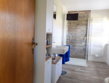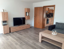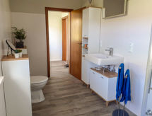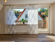 Apt 3 pièces 80 m2 au 1er étage. Aménagement moderne et plaisant: séjour/chambre à coucher avec 1 divan-lit, TV (satellite) et écran plat. Sortie sur le balcon. 1 chambre avec 2 lits (90 cm, longueur 200 cm). 1 chambre avec 1 lit double (180 cm, longueur 200 cm). Cuisine (4 plaques vitrocéramiques, grille-pain, four micro-ondes, congélateur, cafetière électrique) avec table pour les repas. Douche/WC. Chauffage au fuel. Balcon 12 m2. Mobilier de balcon, réduit. Belle vue sur les alentours. A disposition: chaise haute pour enfant, lit bébé. Internet (Connexion WIFI, gratuit). Place de parking près de la maison. Veuillez noter: logement non-fumeur. Détecteur de fumée, extincteur.- Installations