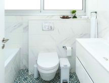 Maison individuelle, 4 pièces pour 7 personnes, 130 m2, moderne aménagement. Séjour/salle à manger avec TV régional, TV (satellite) et DVD. Non permis de fumer. Internet (Connexion WIFI). Chambre à coucher avec 1 lit double. Chambre à coucher avec 1 lit double. Chambre à coucher avec 1 lit normal et 1 lit superposé. Cuisine/séjour avec four à 4 plaques, four micro-ondes, four, table pour les repas, lave-vaisselle, réfrigérateur et congélateur. Salle de bains, douche/WC et WC séparés. Balcon, jardinet, meubles de terrasse. Autres fournitures: coffre-fort, sèche-cheveux, fer à repasser, lave-linge. 1 guest toilet. 1 family bathroom with bath tub. 1 en-suite bathroom with toilet and shower room. All bathrooms have with washing basins.- Caractéristiques de l'hébergement