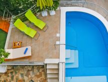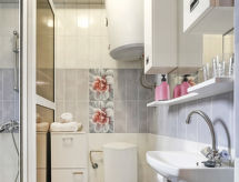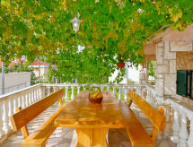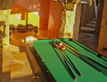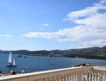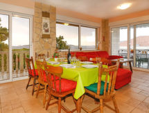 Okrug Donji à 8 km de Trogir: Maison individuelle "Šitić", de 2 étages. Situation tranquille, ensoleillée, à 50 m de la mer, à 50 m de la plage. A usage privé: terrain 370 m2 (clôturé), piscine (18 m2, profondeur 150 cm, disponibilité saisonnière: 01.Mai. - 15.Oct.) avec marches intérieures. Piscine de forme irrégulière. Douche extérieure, terrasse (20 m2), meubles de jardin, barbecue. Infrastructures de la Maison: accès internet, billard, baby foot, lave-linge. Place de parking (pour 2 voitures) près de la maison sur le terrain, garage individuel. Magasins 1 km, restaurant 5 km, plage de graviers 700 m, plage de rochers 50 m. Veuillez noter: Aéroport 14 km de la maison. La maison consiste en 2 appartements loués ensemble. Le 2ème étage est fermé et inoccupé. Piscine hydromassage.Interior