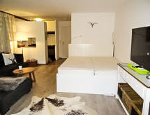 Studio 40 m2. Rénové en 2013, aménagement de bon goût: séjour/chambre à coucher avec 1 lit double (180 cm), TV (câblée) (écran plat), chaîne stéréo. Cuisine ouverte (four). Bain/WC. Sol en parquet. Jardinet. Meubles de terrasse. Vue sur les montagnes. A disposition: Internet (Connexion WIFI). Veuillez noter: logement non-fumeur.- Caractéristiques de l'hébergement