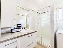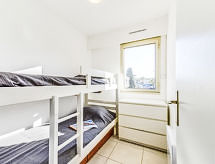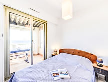 Apt 3 pièces 35 m2 au 1er étage, situation sud. Aménagement fonctionnel et confortable: séjour/salle à manger avec baie vitrée avec 1 divan-lit double (1 x 140 cm, longueur 190 cm), TV (écran plat), air-conditionné et volet roulant électrique. Sortie sur la terrasse. 1 chambre avec baie vitrée avec 1 grand-lit (1 x 140 cm, longueur 190 cm), radiateur électrique. Sortie sur la terrasse. 1 chambre avec 1 x 2 lits superposés (80 cm, longueur 190 cm), radiateur électrique. Cuisine ouverte (four, lave-vaisselle, 3 plaques vitrocéramiques, grille-pain, bouilloire électrique, four micro-ondes, congélateur, cafetière électrique, Capsules pour machine à café (Nespresso) (NON INCLUSES)). Douche, WC séparé. Chauffage électrique, chauffe eau (100 litres). Terrasse 11 m2, situation sud. Meubles de terrasse, chaises longues (2). Belle vue sur la mer. A disposition: lave-linge. Internet (Connexion WIFI, en sus). Place de parking No 15 (cloturée). Veuillez noter: TV seulement FR. Détecteur de fumée.- Installations