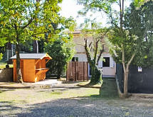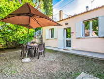 Maison 2 pièces 30 m2. Aménagement rustique: petit séjour/salle à manger avec 1 divan-lit. Sortie sur le jardin. 1 chambre double avec douche/bidet/WC. Coin cuisine dans l'entrée (2 plaques de cuisson, four micro-ondes). Jardin. Place pour s'asseoir.- Installations