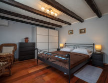 Maison jumelée 3 pièces 130 m2 sur 2 niveaux, situation sud. Aménagement agréable et rustique: séjour avec 1 divan-lit double (140 cm, longueur 210 cm), TV (satellite) (écran plat). Salle à manger 20 m2. Cuisine (four, lave-vaisselle, 4 plaques vitrocéramiques, congélateur, cafetière électrique) avec table pour les repas. Douche/WC. À l'étage supérieur: 1 chambre avec 1 grand-lit (160 cm, longueur 200 cm). 1 chambre avec 1 lit double (2 x 90 cm, longueur 200 cm), air-conditionné. Terrasse 20 m2. Barbecue (portable), chaises longues. A disposition: Internet (Connexion WIFI, gratuit). 1 animal/ chien autorisé. La salle à manger au rez-de-chaussée est aménagée comme une taverne rustique.- Installations